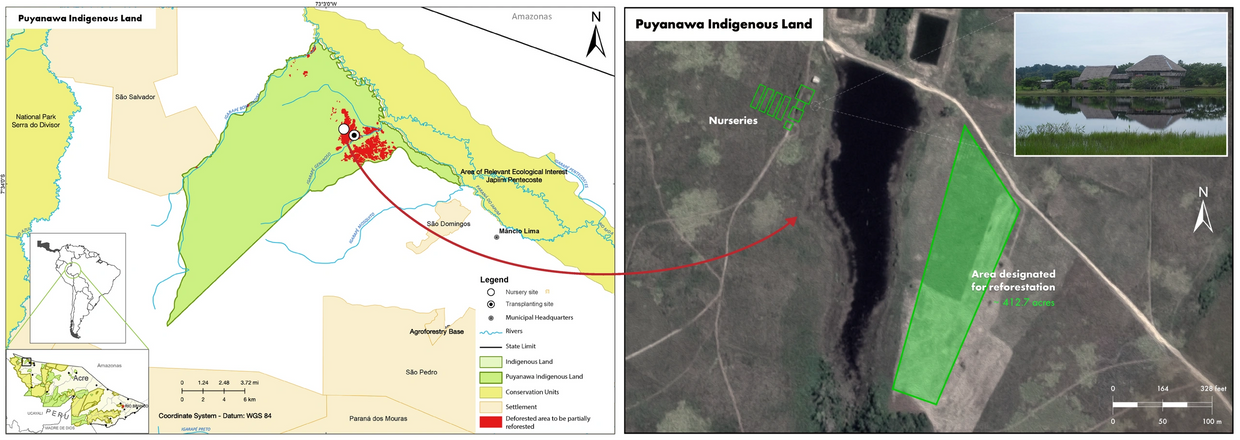 The two communities of Indigenous Peoples working with Amazon Reforest Alliance in this project are the Puyanawa and the Asháninka. With the support of Asháninka's previous experience on agroforestry, members of the Puyanawa community (Map, yellow green) will be planting seeds for trees within their own plant nursery where they will cultivate them into seedlings.